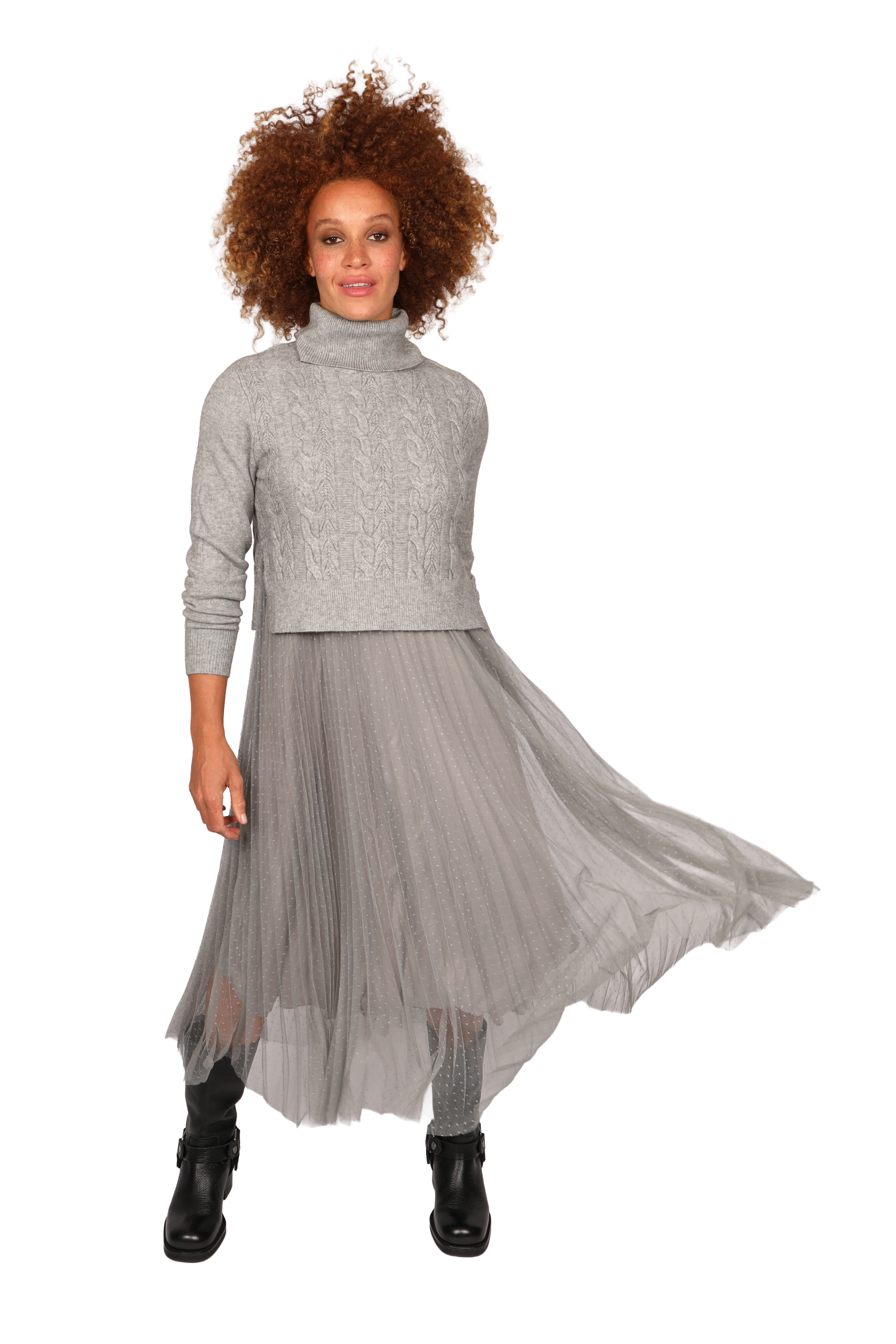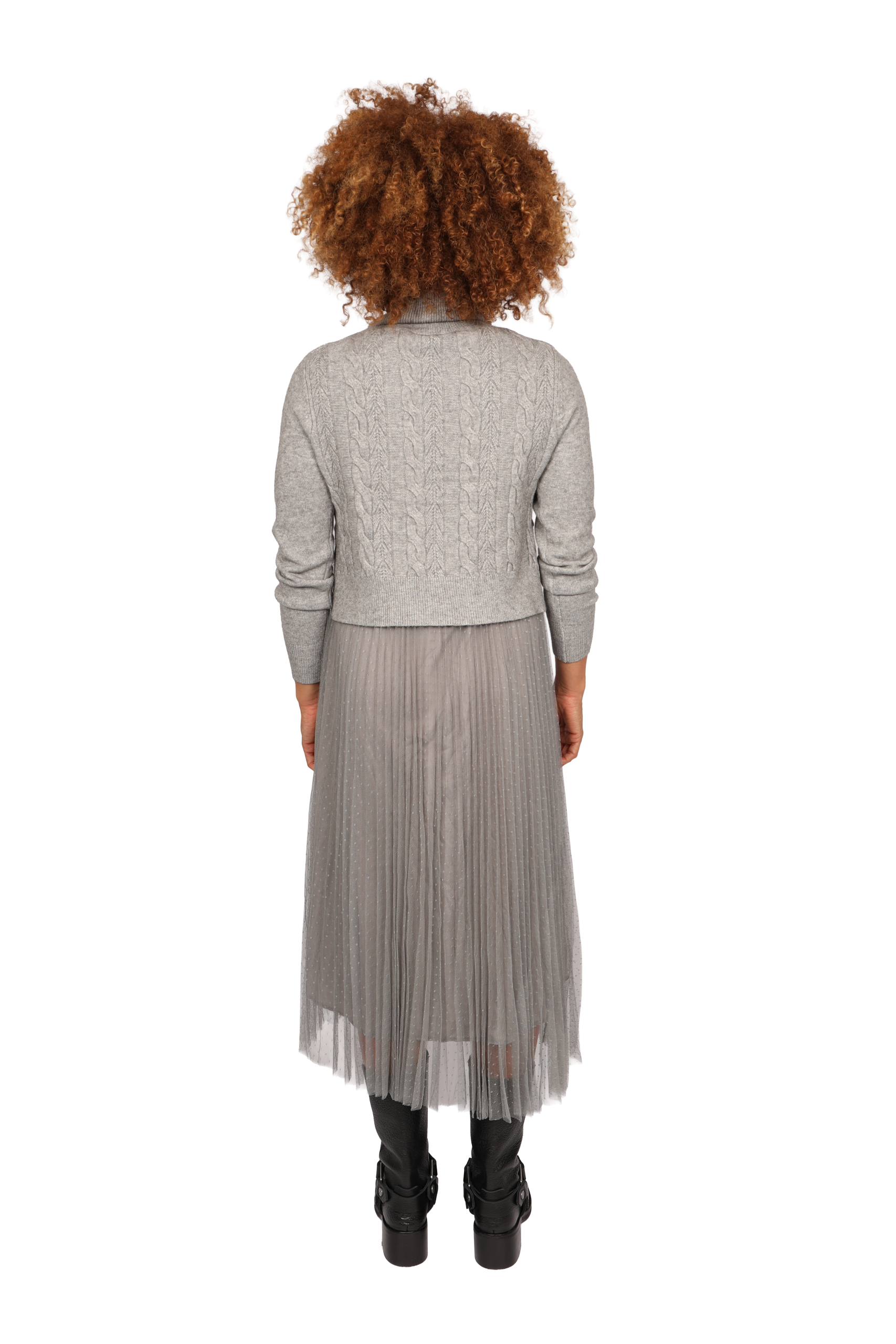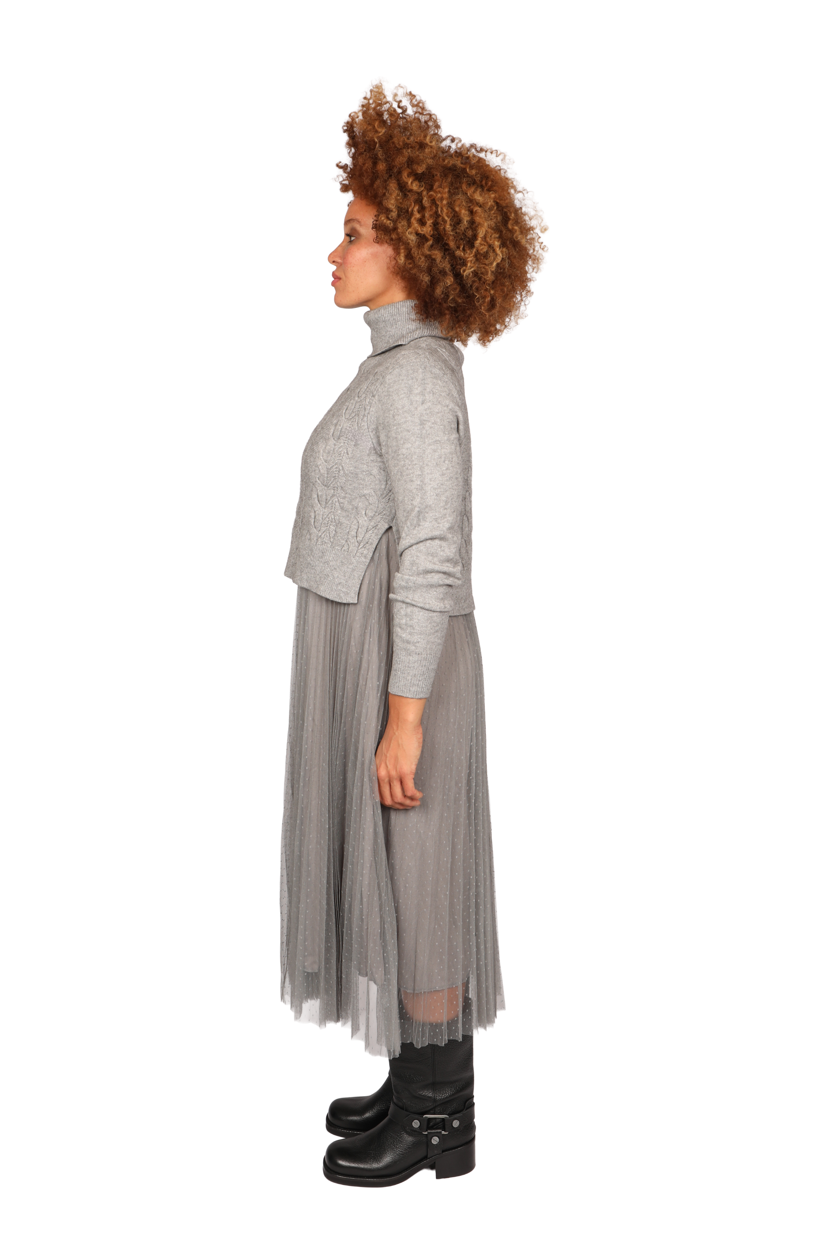 This versatile detachable two-piece jumper dress can be worn together or separately. The base layer is a sleeveless dress designed for extra comfort. The top is made with stretch fabric cut under the bust. The pleated lining is layered with delicate fine tule. The roll neck jumper is long-sleeved with a cable knit front, made with soft Angora yarn blended cleverly to create a stretch knit that is machine washable.