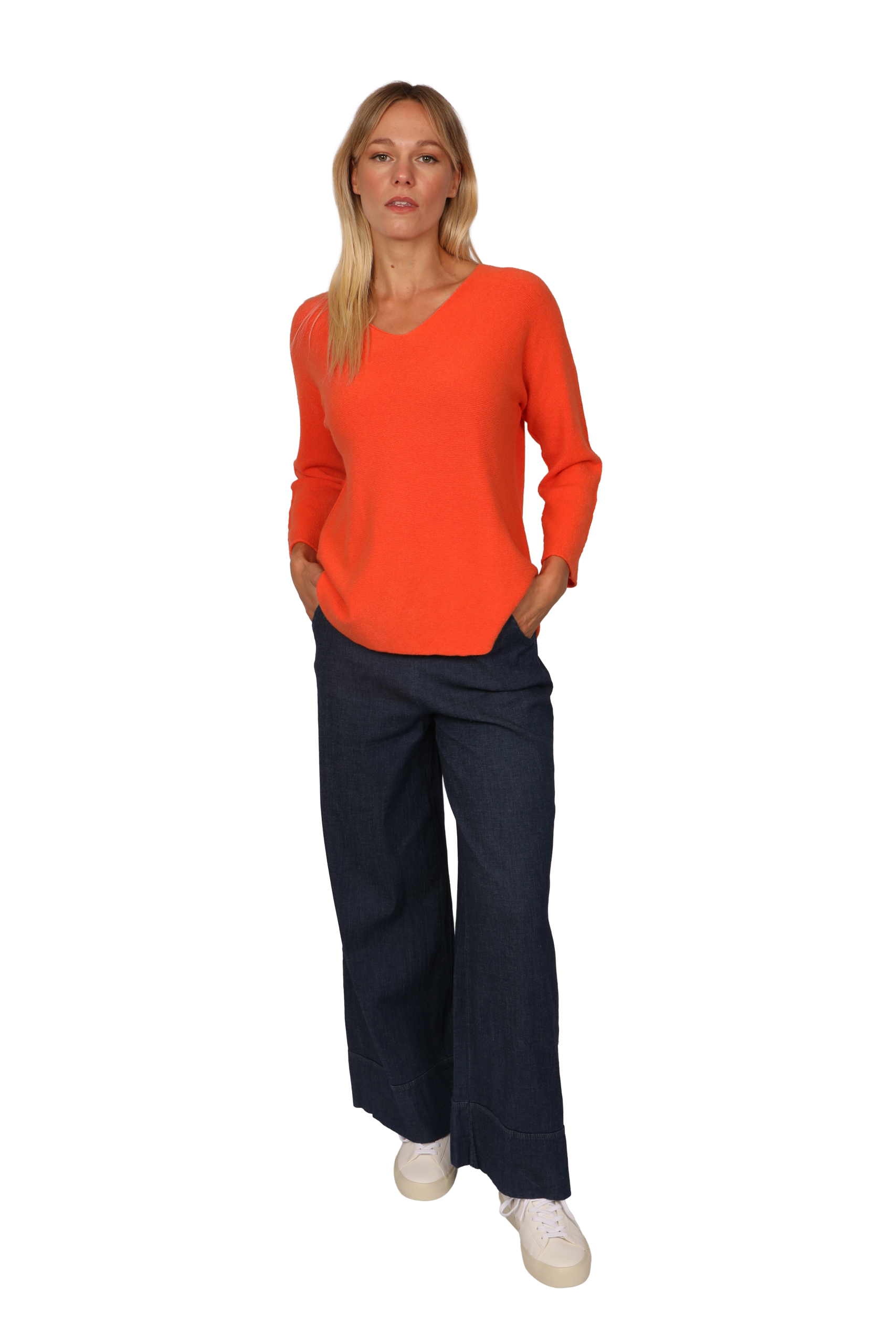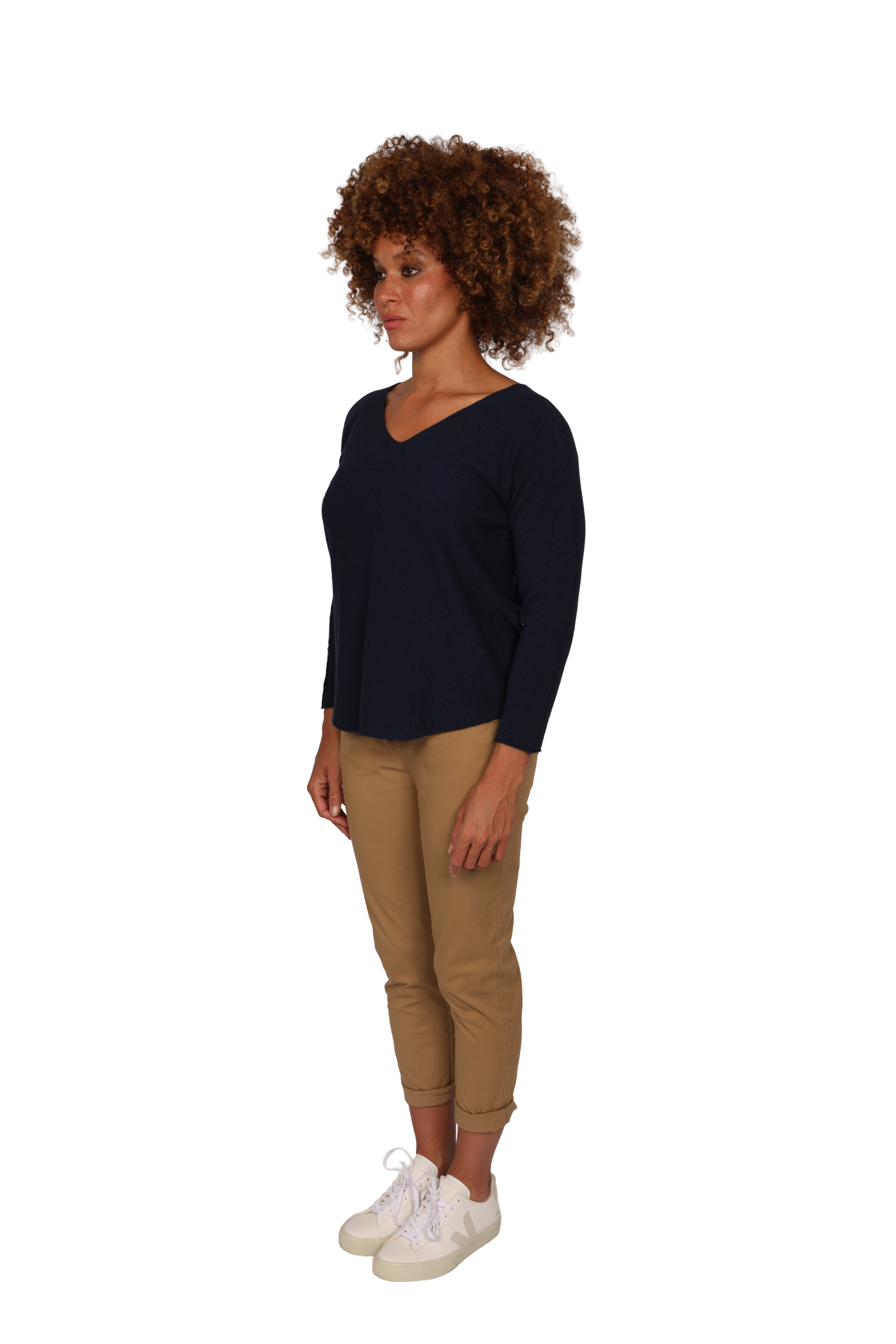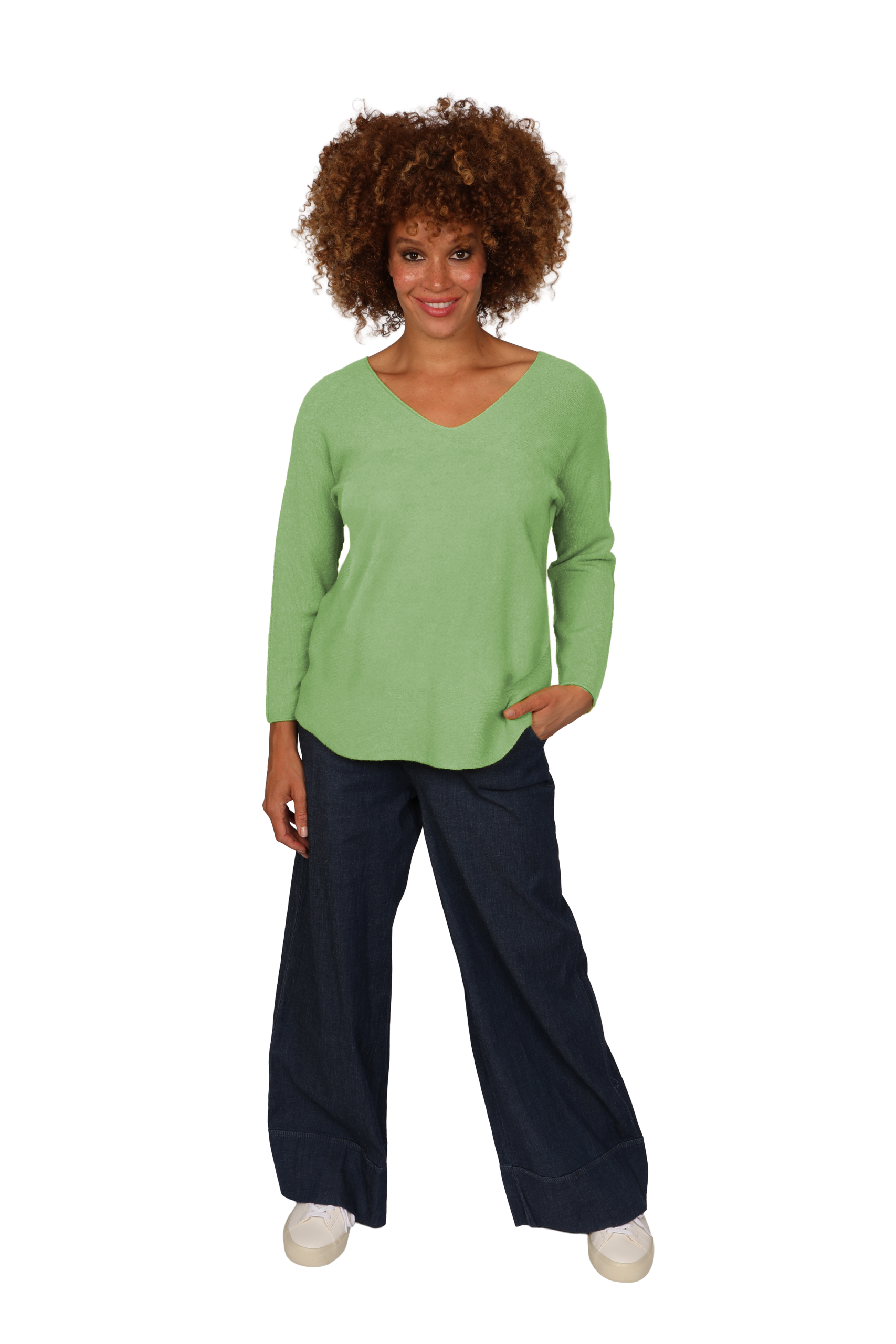 Designed relaxed fit, feminine v-neckline with a dropped curved hem. This style is made using our signature cloud yarn giving a supersoft cashmere feel made with natural fibres perfect for layering a classic must have.