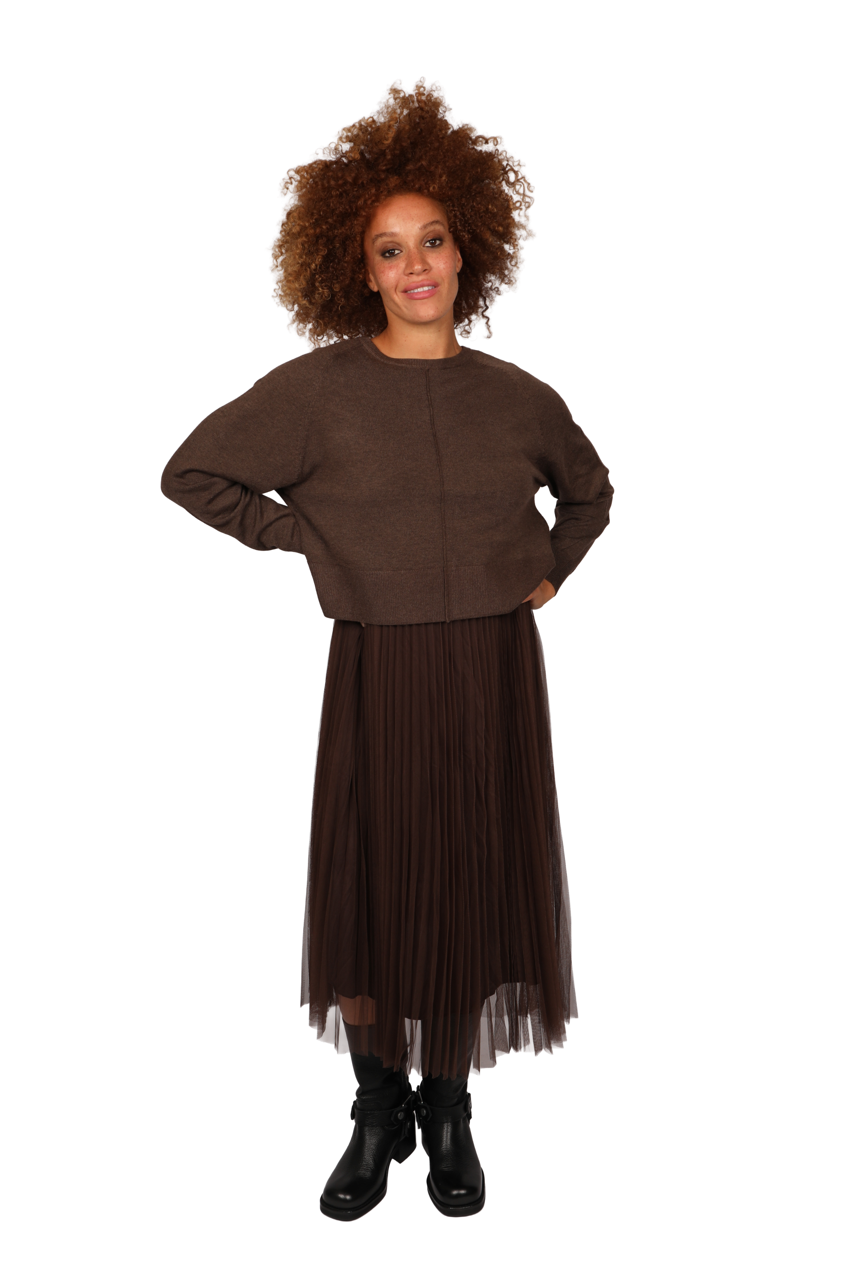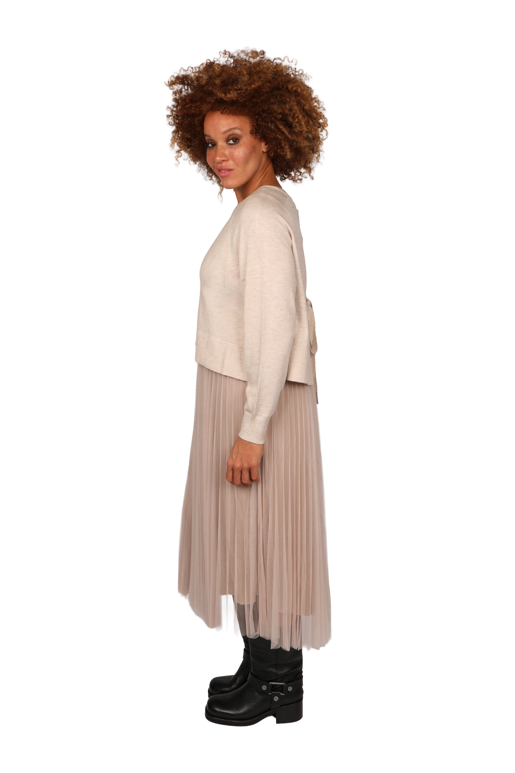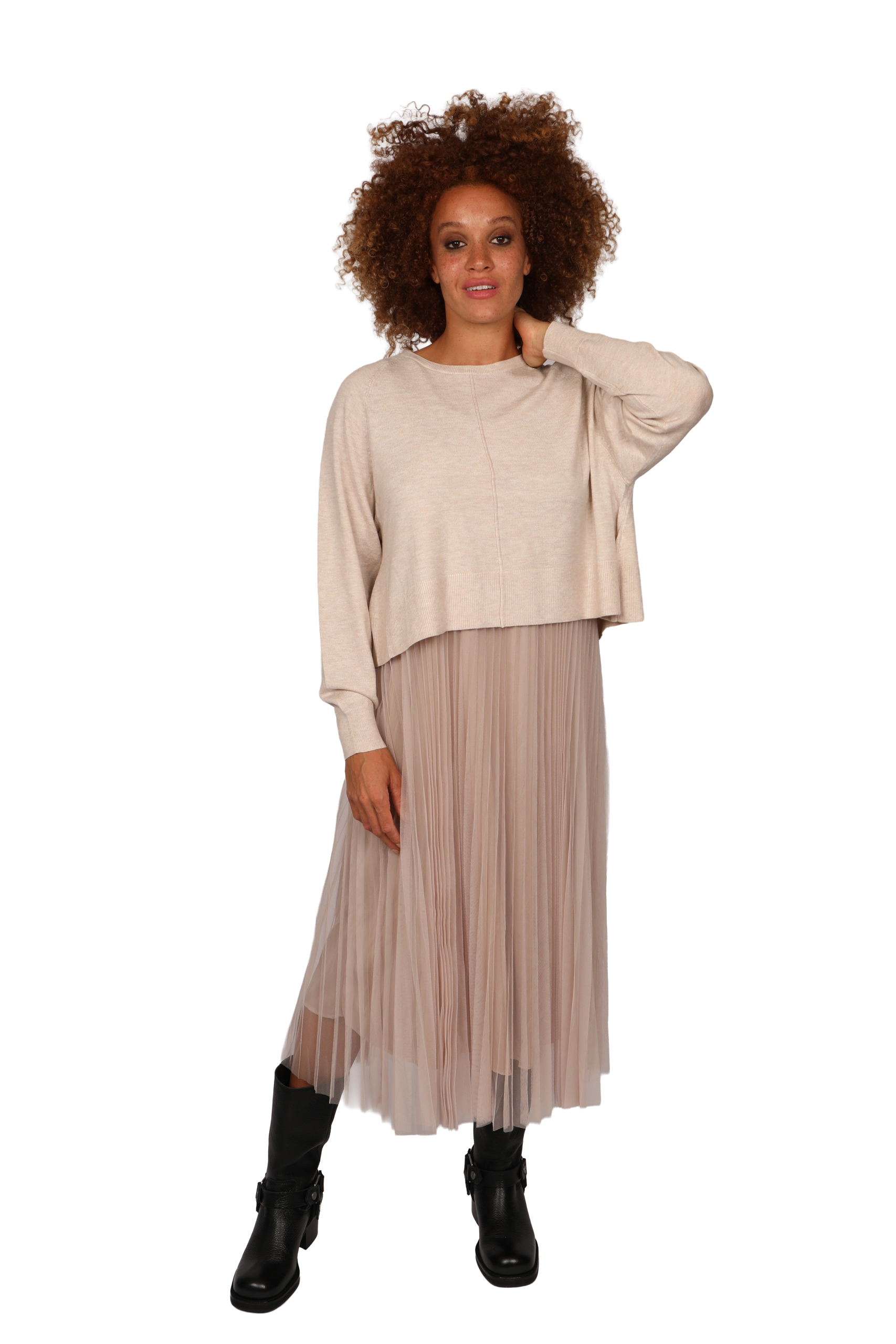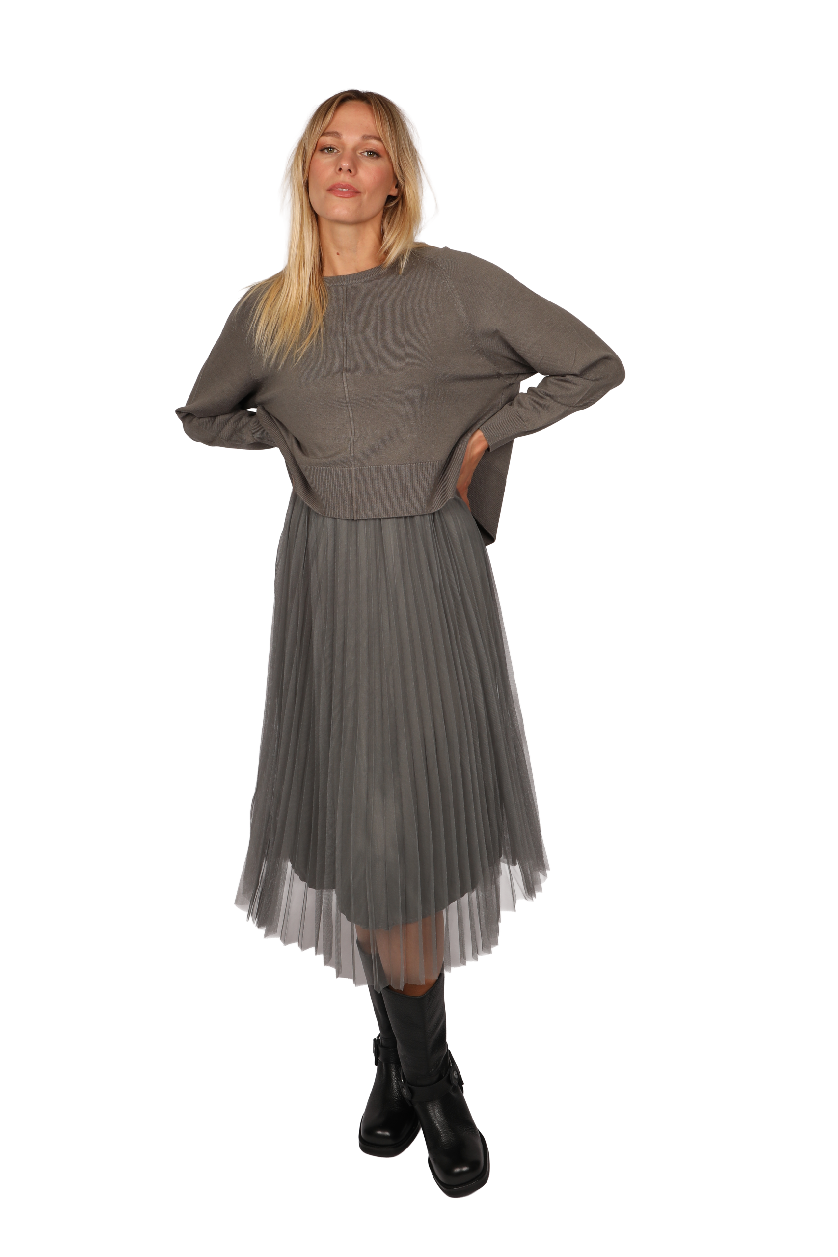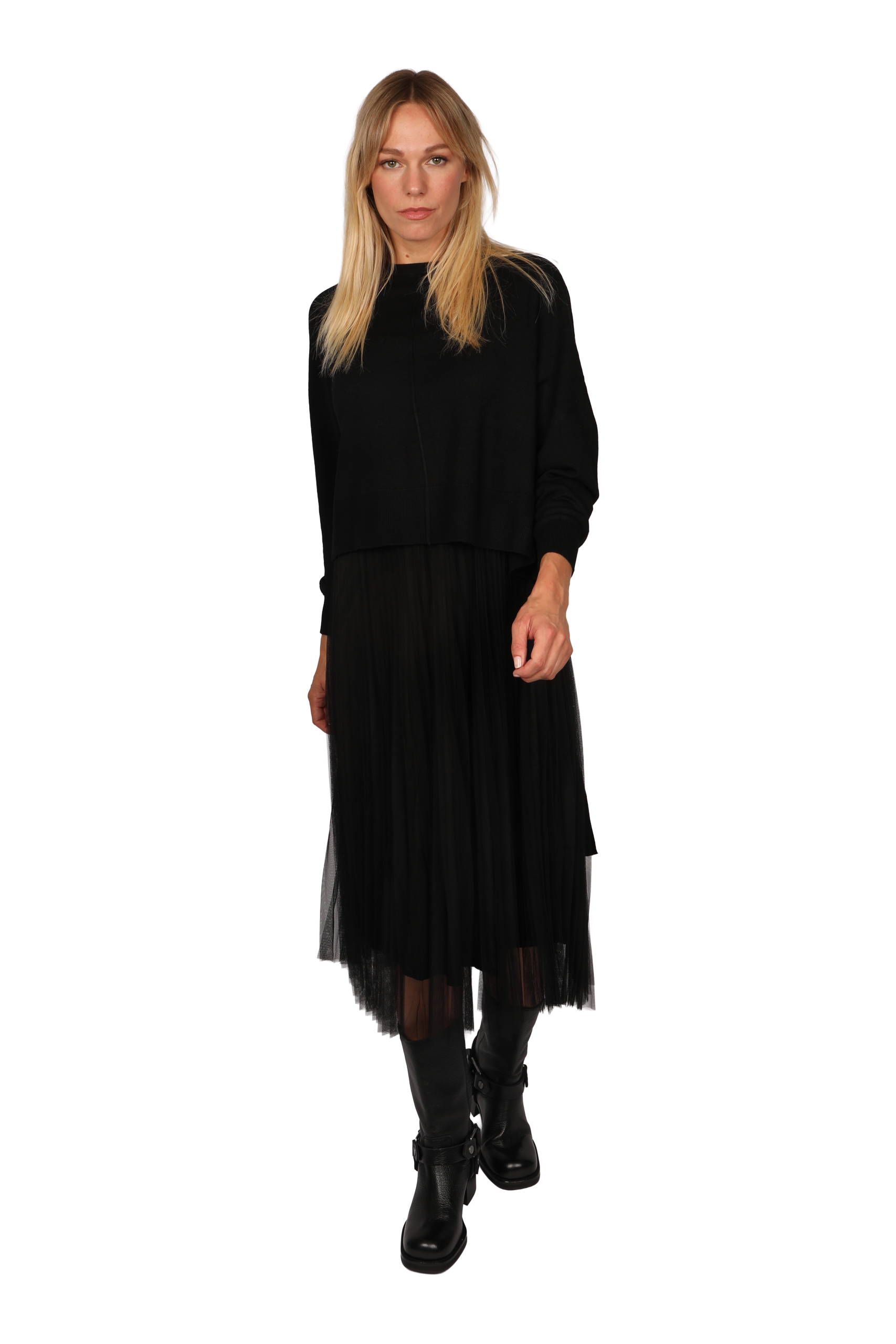 This versatile detachable two-piece jumper dress can be worn together or separately. The base layer is a sleeveless dress designed for extra comfort. The top is made with stretch fabric cut under the bust. The pleated lining is layered with delicate fine net tule. The jumper is designed cropped, featuring a split tie back and front seam detail.